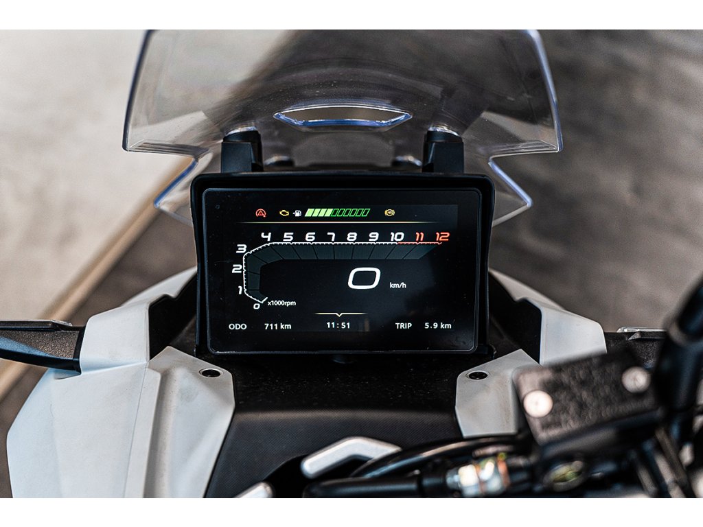 Velký barevný TFT displej o velikosti 7 palců vás přehledně informuje o všem důležitém. Rychloměr, atraktivní grafický otáčkoměr i ukazatel paliva jsou perfektně čitelné, nechybí hodiny ani kontrolky trakce nebo systému ABS.